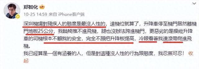 当监控画面开口说话 本月26日,一则来自歌手郑智化的微博,像一颗投入平静湖面的石子,瞬间激起千层浪。他那句怒气冲冲的“深圳机场太没人性,让我连滚带爬上飞机!”,字里行间充满了委屈与愤怒,迅速点燃了公众的情绪。 毕竟,郑智化这个名字,承载了一代人的青春记忆。他的《水手》和《星星点灯》,是刻在无数人心里的励志符号,代表着不屈和坚强。这样一个正能量偶像的控诉,自然让无数网友瞬间“破防”,舆论几乎立刻一边倒,矛头直指深圳机场的无障碍设施和员工服务。