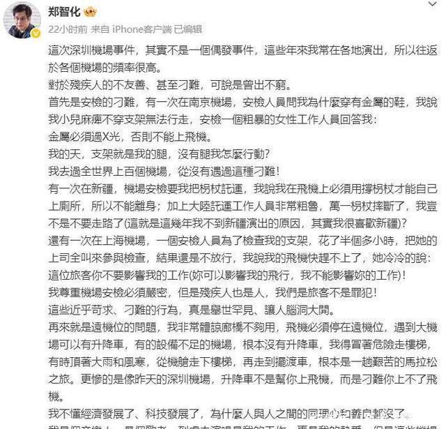 也许是感受到了舆论的压力,郑智化没有沉默,而是再次发布长文,这次他不再局限于深圳机场的某一位司机,而是将“战场”无限扩大,直接点名“大陆所有机场”。 他细数了自己近年来在内地乘坐飞机时遭遇的种种“刁难”。他说,在南京机场,安检人员曾要求用X光检查他的金属假肢,他无法理解并予以拒绝;在上海机场,一次安检耗费了他半小时,甚至还叫来了领导复查;在新疆机场,他被要求将赖以行动的拐杖办理托运,他担心托运损坏,更直言“大陆托运人员很是粗鲁”。